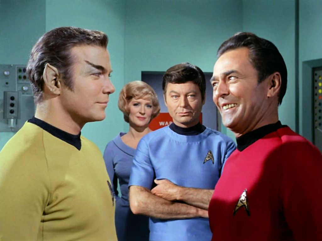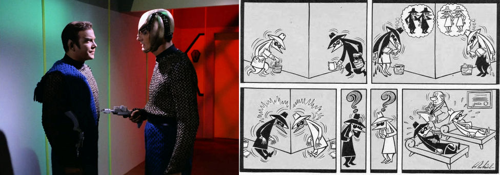 More troubling is McCoy’s masterful transformation of Kirk into a Romulan officer. If humans can so easily impersonate Romulans, and vice versa, the galaxy is reduced to a massive Spy vs. Spy operation. Remember how perfectly the Klingon spy in “The Trouble with Tribbles” resembled a human? On the other hand, maybe more such identity swaps would generate empathy. One of the greatest risks of undercover surveillance is that spies might become sympathetic to their targets. Both Spock and the Commander seem to have experienced this in each other’s company – small wonder that it’s Spock who travels undercover to Romulus in the TNG episode “Unification.” Given time, Kirk-as-Romulan may have learned the same empathy. This compassion is ultimately what “The Enterprise Incident” is all about. The three leads, Cold Warriors all, end up a little wiser with no blood shed. Imagine if this empathy could be shared up the chain of command. If we’re not careful, we may learn that our enemies are not so alien, after all.