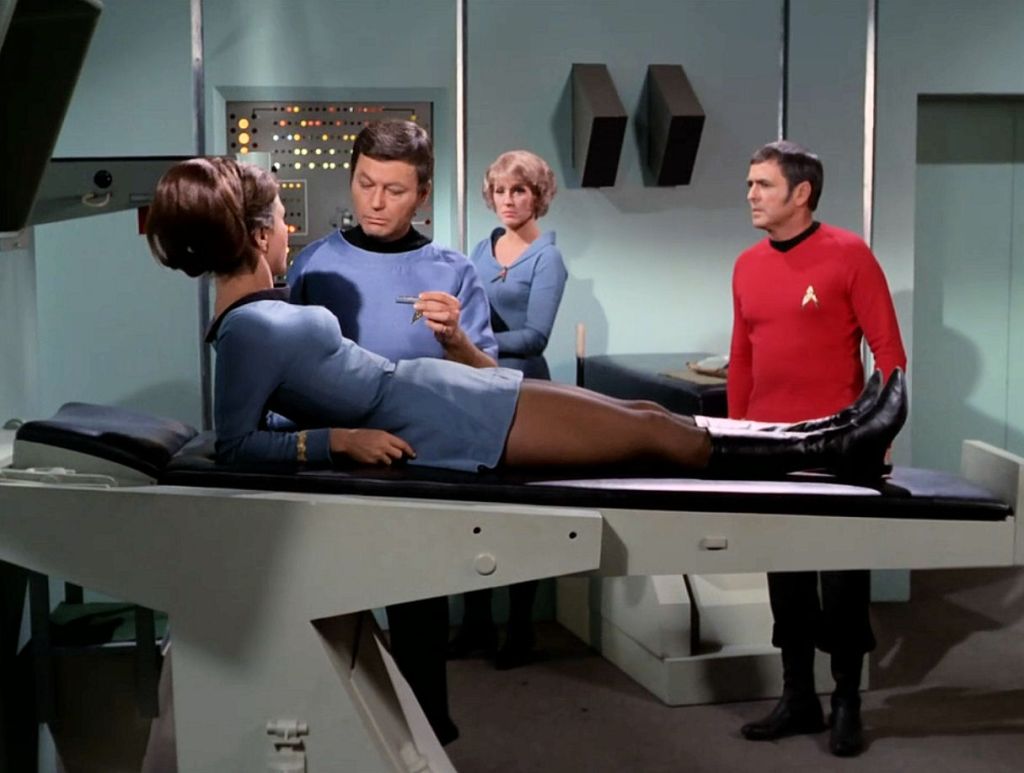 Ageism aside, “The Lights of Zetar” is one of those original series productions where the sexism is so rampant as to be a distraction throughout the episode. Scott’s obsessive hovering over Romaine is offensive enough, but Kirk, McCoy, and even Spock repeatedly refer to Romaine as “the girl.” They do this so often that it feels like a deliberate attempt to diminish her character. Even the Zetars get in on the act, saying, “We only want the girl.” During the conference room scene – one of the weakest of such scenes in the series – the officers try to decipher what’s going on with Romaine. Kirk tells her in his most fatherly tone, “A ship’s investigative procedures are sometimes confusing to a new crewman. Don’t let us upset you.” Aren’t the “procedures” simply asking questions about what happened? How dumb does Kirk think Romaine is? (In fact, she might be pretty dumb, based on some of her vacuous statements.) All this misogyny gets us closer to the real reason Romaine is the victim: she’s a woman. We can’t help but recall Spock’s offensive line from “Wolf in the Fold”: “…women are more easily and more deeply terrified, generating more sheer horror than the male of the species.” The one victim on Memory Alpha still alive when the landing party arrives – the one person the Zetars made a serious attempt to possess – is also a woman, implying that the Zetars agree with Spock. The episode’s turning point, the moment when we know the Zetars will be defeated, is when Romaine fully submits to male leadership: “Tell me what to do,” she says to Kirk. In the final scene, Kirk, Spock, and McCoy all agree that Scott’s affection for Romaine was a significant factor in her ability to fend off the Zetars and survive. So after Romaine is demeaned and assaulted, a man gets all the credit! And the final insult: Kirk, McCoy, Spock, and Scott – only one of whom is an actual medical professional – decide unanimously that Romaine is recovered and fit for duty without bothering to ask Romaine herself how she feels.