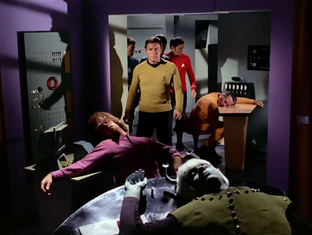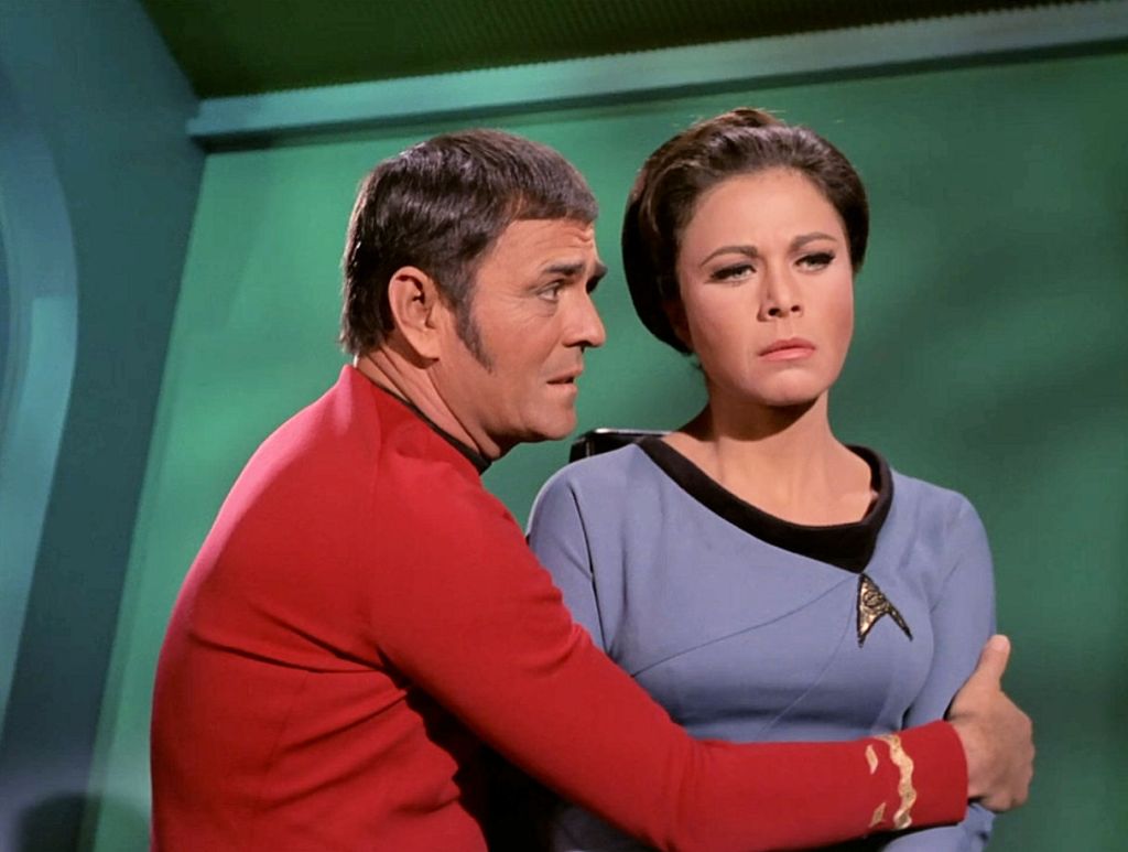 The truth is, there’s no reason for Romaine to even appear in the episode. She’s only here as a link to Memory Alpha, and the intriguing galactic library concept is never developed; it’s simply a stand-in for the planet-of-the-week. By episode’s end, the Enterprise is headed back to Memory Alpha so Romaine can resume her duties, the “irretrievable” loss Spock talked of earlier completely forgotten. (The dead Memory Alpha staff are equally forgotten – don’t they need some new librarians?) The Zetars could easily have targeted one of our existing crew members and given one of the regular supporting cast members something interesting to do for a change. If the producers were determined to send the Zetars after a woman, then Uhura and Chapel were right in front of them.