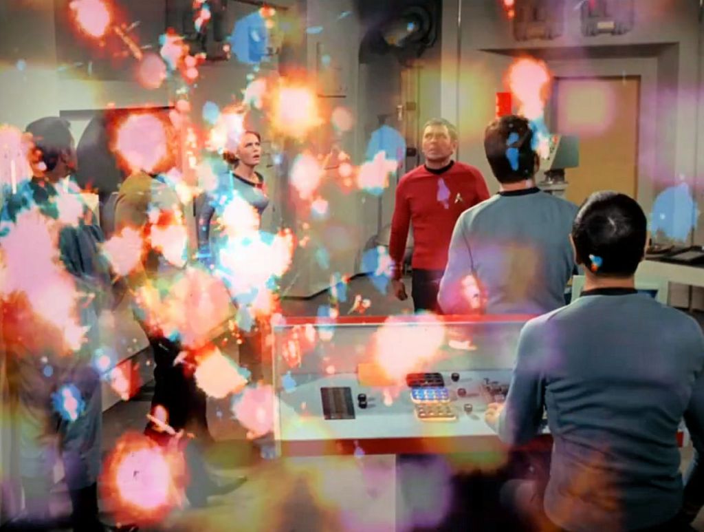 The lights – the entire reason for the episode’s existence – behave inconsistently, and their true nature is not revealed to us until the end of the episode. The lights are from the planet Zetar, with which Kirk and Spock already seem familiar. Spock points out that all life on Zetar died centuries ago in some unspecified manner; the lights specify that only corporeal life died. The lights represent the last one hundred surviving Zetars (because one hundred is a nice round number!); they are “the desires, the hopes, the mind, and the will of the last hundred of Zetar. The force of our life could not be wiped out.” So if you believe you can control the universe with your mind, you might be from Zetar. This New Age meandering gives us no real insight into the Zetars or why the last one hundred of them were so special.