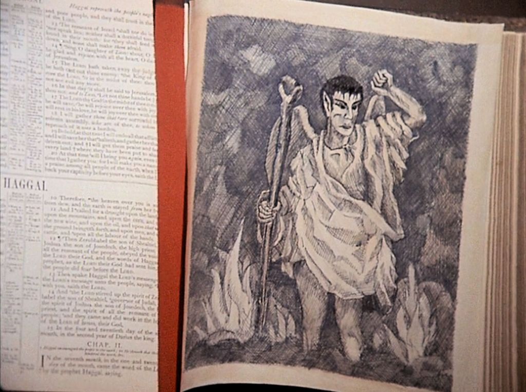 Despite calling freedom a worship word, Cloud William is a poor disciple. After Kirk defeats Tracey and Sulu beams down with company – that materialization act must be magic! – Cloud William literally gets on his knees before Kirk. “You are a great god servant,” he tells the captain. “We are your slaves.” I guess the Yangs don’t have the Thirteenth Amendment yet – hang in there, slaves! There is a lot of god talk equally inconsistent with freedom, but equating divinity with nationalism fits perfectly in the raw sewage of the final act. When Kirk explains that his home is in distant space, he sounds like a religious man, telling Cloud William, “You’re confusing the stars with heaven.” Tracey, on the other hand, says to Cloud William, “Let your god strike me dead if I lie.” This implies Tracey is an atheist, because he clearly knows he is lying. And like all sinister atheists, Tracey gladly manipulates the Yangs’ religious beliefs, calling Spock “the servant of the evil one” based on his appearance. Thankfully, Cloud William has a BIBLE handy – really, all this episode lacks is a Ford pickup with a gun rack in the window – which he opens to the Book of Haggai, where there is an illustration of the devil that looks exactly like Spock. The Book of Haggai was written to motivate the people to build the second Jerusalem temple, the first one having been destroyed by…get ready for it…foreign invaders! They’re rebuilding, get it? Such sophisticated symbolism! In the end, Cloud William remains a freedom lightweight: when Kirk demands (“helps”) that the Constitution be shared equally with both Yangs and Kohms, Cloud William admits he doesn’t understand but will do it anyway because the man from the sky with magic powers told him to.