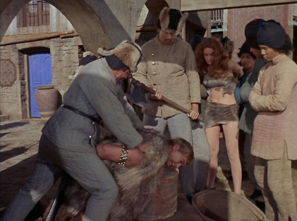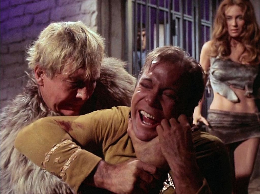 Is the name Omega significant? You bet it is. Omega is the end of the Greek alphabet and literally translates as “great O.” It is often used to indicate the end of something or the ultimate limit of a set, and when we see that U.S. flag we know we need look no further because we have sure reached the pinnacle of human achievement now, Comrades! We get a feeling of dread earlier in the episode, when Kirk is locked in a cell with Cloud William and his woman Sirah (Irene Kelly), who doesn’t get to speak a word of dialogue but who cares because she looks good in an animal-skin bikini. Kirk talks of escaping to freedom and Cloud William, who has communicated in nothing more than grunts and gestures until now, suddenly lights up at the word “freedom” because that is a Yang worship word. That’s not surprising, because naturally the English word “freedom” is a magical term that is universally understood by all life forms, even aliens, animals, and plants! That’s why the “holy words” of the Constitution must be shared with the Kohms, because they are godless savages and we must inflict our freedom on them regardless of the fact that freedom is a vague term that means different things to different people and did somebody say something about noninterference?