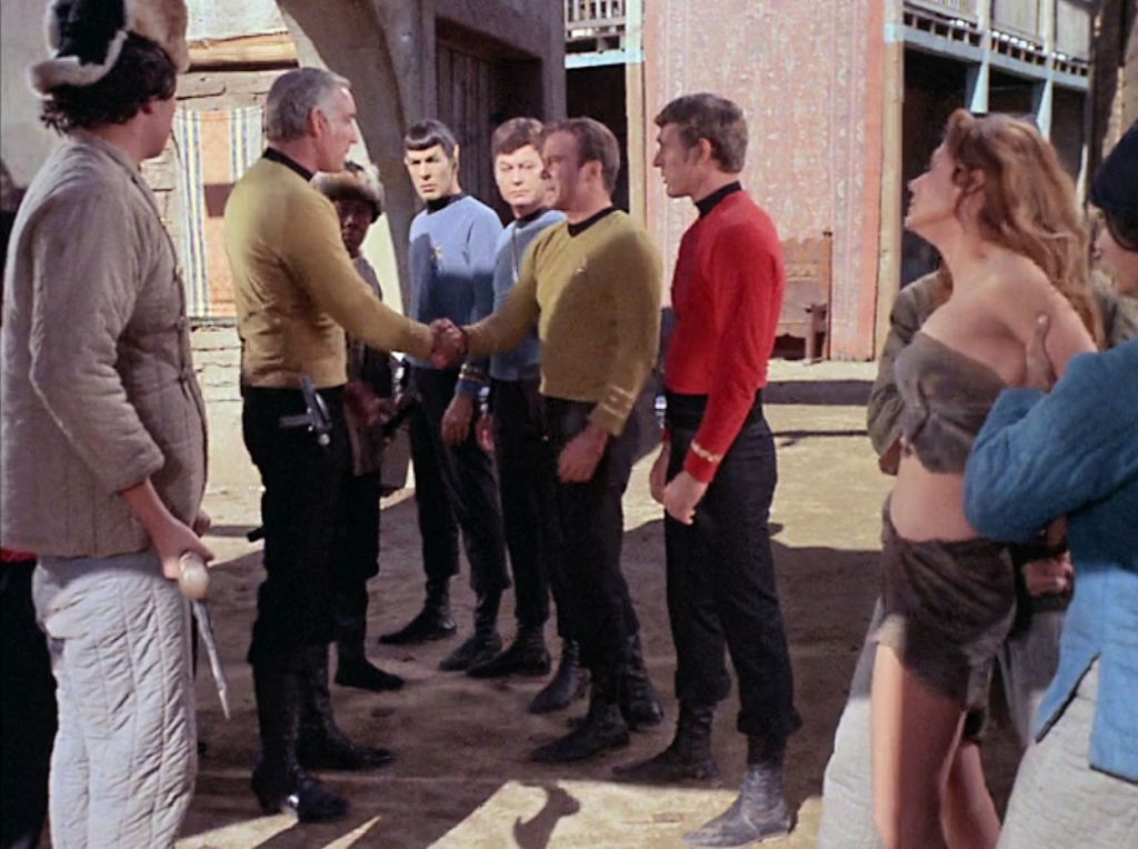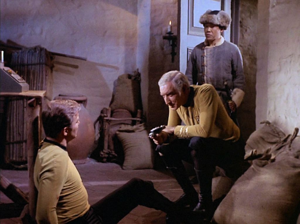This longevity is what Tracey hopes to exploit in an outlandish plan that requires McCoy to devise a serum, which Tracey will ransom in exchange for a fleet of starships. We have no reason to think the Federation, or anyone else for that matter, would make such a bargain with Tracey. Tracey is also ignoring the Federation’s track record in curing diseases – certainly McCoy or some other Federation doctor could whip up a vaccine for the virus, given enough time. And Tracey doesn’t indicate what he plans to do with all those starships, or who would help him operate them, or where he would go, or why is any of this even happening? Nothing Tracey does makes much sense. In “The Doomsday Machine,” Commodore Decker was traumatized after losing his crew. Tracey seems to barely notice, as if he was looking to ditch the troublemakers and strike out on his own all along. Kirk describes Tracey as “one of the most experienced captains in the Starfleet,” putting him in good company with Roger Korby, Dr. Adams, and John Gill, all highly revered individuals who are clearly insane and should never have been given the keys to the car. With Tracey, we repeat the “crazy captain infects a planet by violating the Prime Directive” theme of “Patterns of Force,” and the “longevity associated with a specific location” theme from “This Side of Paradise” and “Metamorphosis.”