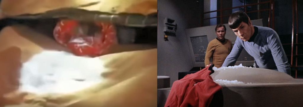 The episode is also a weak entry in the series’ recurring “we weren’t meant for paradise” theme. “Miri,” “This Side of Paradise,” and “What Are Little Girls Made Of?” all did a much better job of rejecting the idea of life extension or perfect health. (Which disappoints me, because if these people were as eager for knowledge as they claim, they would be all over these immortality opportunities.) Tracey continues a long history of humans searching for a fountain of youth, an elixir of immortality. The first known such claim comes from the writings of Herodotus, reporting that Macrobians residing in the Horn of Africa lived past the age of 120 from eating primarily meat and milk – so keep hope alive, Paleo dieters! In the case of Omega IV, we don’t even know if the inhabitants’ extreme ages are reliable. Tracey says, “No native of this planet has ever had any trace of any kind of disease.” He must be relying on oral statements, because he has only been here six months, and neither the Kohms nor the Yangs come across as careful record keepers. They could be boasting in order to impress a foreign visitor, for all we know. Regardless, McCoy states his opinion of life extension clearly: “I can do more for you if you just eat right and exercise regularly.” Kirk is even more succinct when he explodes at Tracey late in the episode: “There are no miracles! There’s no immortality here!” By that time, Tracey is too far gone, and too worried about consequences for his bizarre actions – he has already killed poor Galloway – and threatens to kill the others.