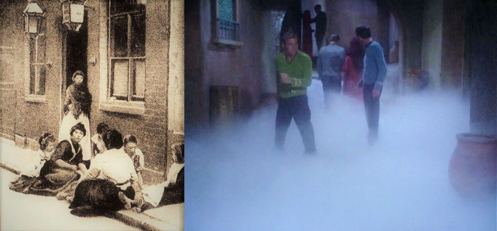 We can only wonder how people in the twenty-third century are familiar with Jack the Ripper, and not just humans but natives of Argelius II and Rigel IV (the home of local administrator Hengist, more on him later). In our own time, however, “ripperology” is big business. Eleven women were murdered in or near London’s Whitechapel neighborhood from 1888 to 1891. (Our brief glimpses of Argelius II’s urban exteriors reveal a similarity to Whitechapel of that era.) Whitechapel, part of London’s East End, was crowded and impoverished at the time: the neighborhood offered sixty-two brothels, crime was rampant, and 55% of children died before the age of five. The East End was the site of the Bloody Sunday labor demonstrations of 1887. Of the eleven Whitechapel deaths, five are considered “canonical,” or having definitely been committed by Jack the Ripper. Police conducted approximately two thousand interviews and police surgeon Thomas Bond developed the first known criminal profile, but no compelling suspect was ever identified. The Whitechapel murders occurred during a time of increasing literacy rates in England and tax reforms encouraging more affordable newspapers. This confluence of events made “Jack the Ripper” the first serial killer to achieve widespread notoriety. Red Jack thrives by feeding on the fear of its victims; we can easily imagine the women of Whitechapel lived in the fear endemic to a life of poverty and crime. Many of Whitechapel’s slums were cleared in the years after the murders, but the pattern of using fear to exploit victims lives on. The Enterprise computer cites a list of later serial killers on multiple planets, all targeting women.