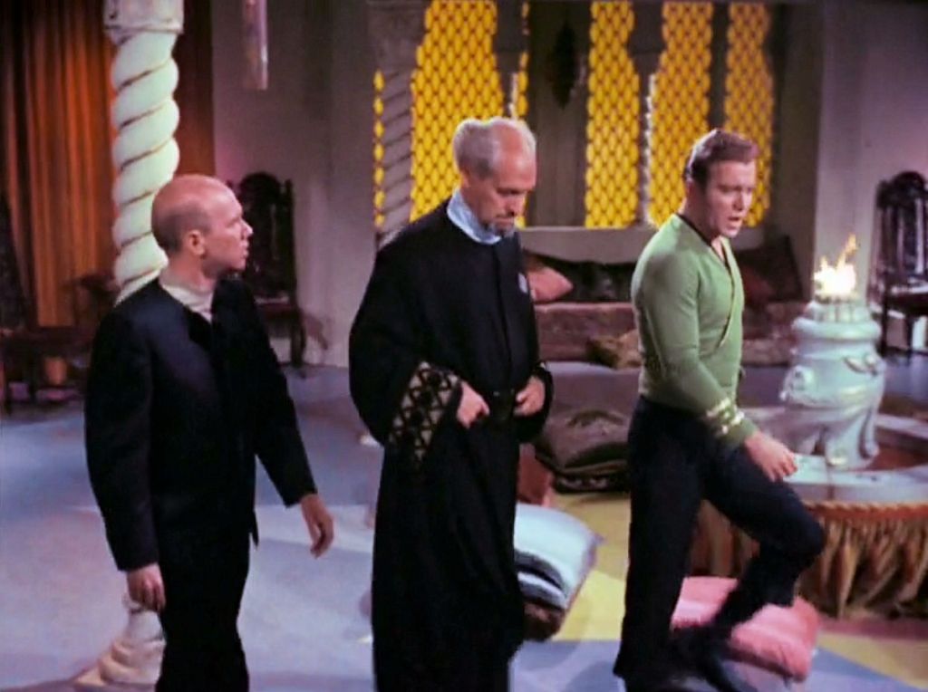 The setting, Argelius II, is critical to the story. The planet is just the spot for shore leave because it is, according to McCoy, “a completely hedonistic society.” At least some of the crew has previous experience here, as Kirk and McCoy are both familiar with “a place where the women-” Thankfully, they never finish the thought. Argelius II also has, per Kirk, “strategic importance as a space port;” in fact, it is “the only one in the quadrant,” according to Prefect Jaris (Charles Macaulay, who bears an astonishing resemblance to Landru from “The Return of the Archons”). Yet, the Argelians “aren’t very efficient” and are “a gentle, harmless people,” as we’re told by Administrator Hengist (John Fiedler), one of the administrative officers hired from off-world for exactly that reason. For “a gentle, harmless people,” the Argelians aren’t shy about cruel and unusual punishment: if Scott is convicted of the murders, the penalty will be “death by slow torture.” And perhaps because of the Argelians’ administrative limitations, the final say in matters of importance seems to rest entirely with Jaris. (“I am the highest official,” he says, without specifying if he’s high on psychoactives or org charts.)