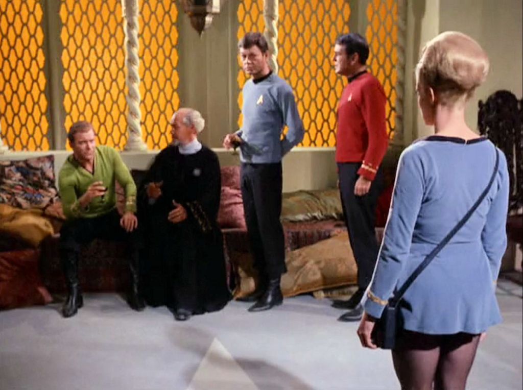 Early on, Kirk conducts himself nobly, committed to respecting Argelian customs. “I have a diplomatic responsibility,” he says. Later, he tells Spock, “It is absolutely imperative this matter be resolved according to Argelian law.” When a female (run for it!) lieutenant beams down to examine Scott with a psycho-tricorder – a laughable mind-reading device created solely to set up the second murder – Kirk tells Scott to “cooperate completely.” There is no wink or nudge in this directive because Kirk has complete confidence in both his crewman’s innocence and the technology at his command. Yet both Kirk and the free-wheeling Jaris lose track of the murder weapon, further encouraging conditions for a second crime.