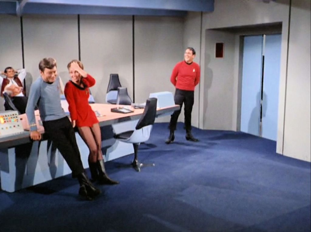 It’s good to see James Doohan front and center in an episode, even though he doesn’t get to do much but proclaim his innocence while simultaneously acknowledging, “I don’t remember.” Scott certainly shouldn’t be left alone with a woman after the first murder, but that’s exactly how the poor lieutenant with the psycho-tricorder ends up dead. The experience will leave such a lasting impression on Scott, he will even refer to it decades later, in the TNG episode “Relics.”